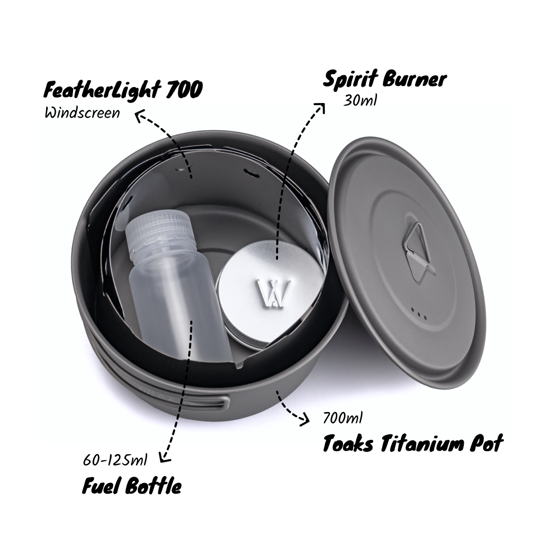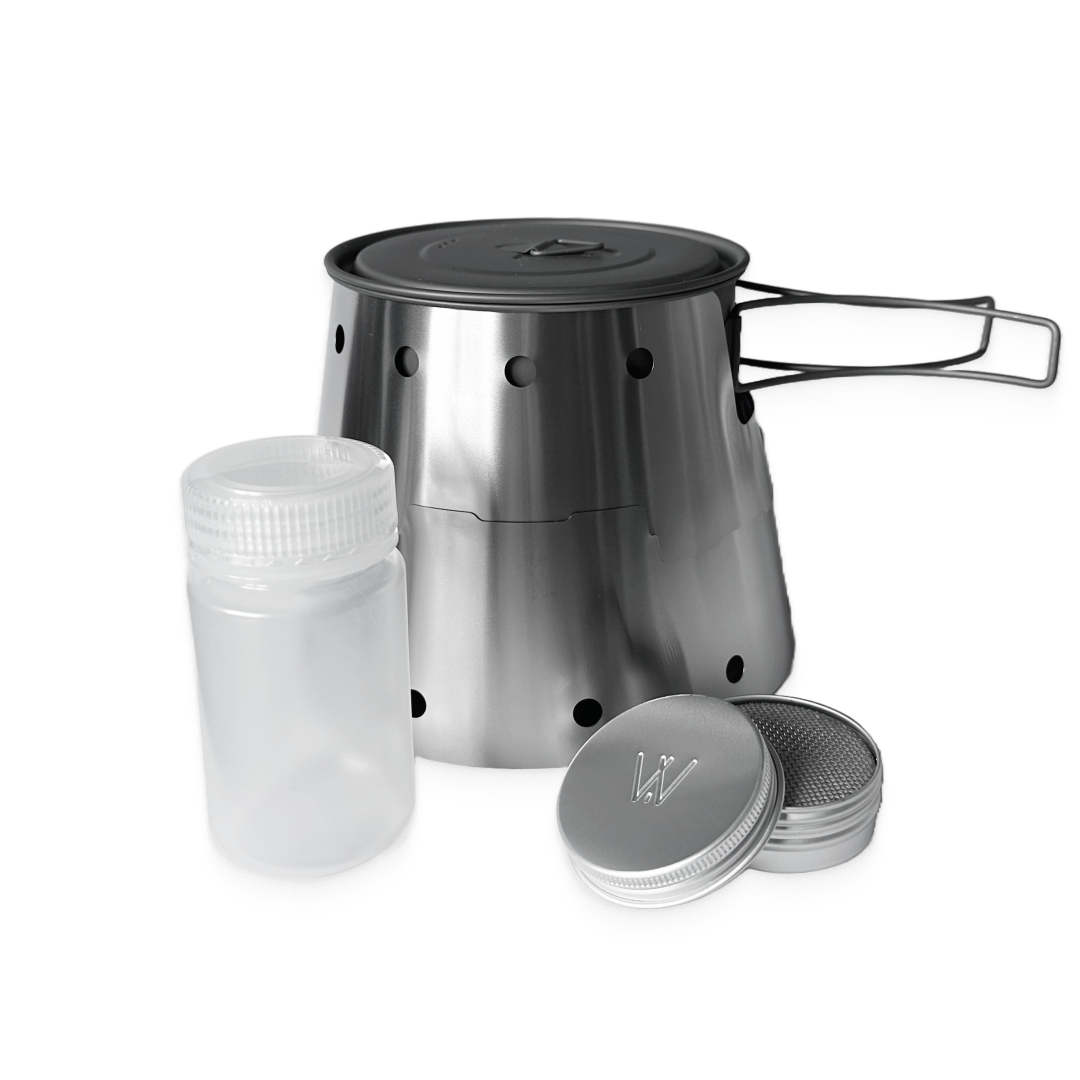 One of the world's lightest and most compact alcohol stove for adventurers seeking a high-quality titanium, efficient, effective and ultralight cooking system. Perfectly designed for backpackers, bikepackers, and campers, this innovative kit ensures you can enjoy a warm meal no matter where your adventures take you.